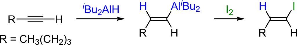 Keywords: DIBAL example 2.svg Scheme of a reaction of hex-1-yn with DIBAL and then with iodine Own 2007-09-13 Calvero Organic syntheses