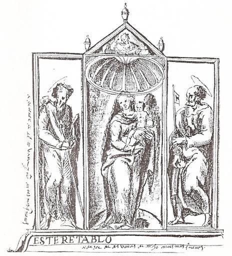 | Keywords: Dibujo de Julián Maldonado.jpg es Dibujo del pintor Julián Maldonado para el retablo de Frades despoblado de la Tierra de Cuéllar -Segovia- Montero Alfonso 2005 «Un dibujo de Julián Maldonado» en Revista La Villa nº 27 págs 29-30 Julián Maldonado ca 1572 Cuéllar PD-old spain in the 1570s |