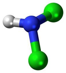 | Keywords: Dichloramine-3D-balls.png Ball-and-stick model of the dichloramine molecule a reactive inorganic compound Colour code F0F0F0 Hydrogen H white<br> 3C50FA Nitrogen N blue<br> 14F014 Chlorine Cl green<br> 2011-05-31 own DS Visualizer Jynto talk Space-filling version cc-zero Dichloramine Images by Jynto Ball-and-stick models |