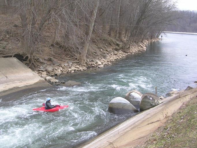 Keywords: Dickerson Course Finish.jpg en Much of the time the Potomac River level is high enough to make the final drop disappear Own HowardMorland 2007-02-11 Dickerson Whitewater Course
