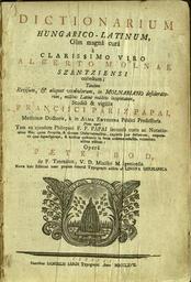 | Keywords: Dictionarium Hungarico-Latinum, Olim magnâ curâ à clarissimo viro.jpg hu Dictionarium Hungarico-Latinum Olim magnâ curâ à clarissimo viro Szenczi Molnár Albert 1574-1633 a magyar reformáció egyik legkiválóbb Ãrója prédikátor szótárkészÃtÅ‘ költÅ‘ fordÃtó Pápai Páriz Ferenc Dés 1649 május 10 “ Nagyenyed 1716 szeptember 10 tanár az orvoslás és a filozófia doktora és Bod Péter FelsÅ‘csernáton 1712 február 22 “ 1769 március 3 református lelkész irodalomtörténész közös műve http //www sk-szeged hu/statikus_html/kiallitas/bocskai/szenci html Szenczi Molnár Albert Pápai Páriz Ferenc Bod Péter Published Cibinii 1767 History of Hungary 1526 “1700 Books in Hungarian Books in Latin Dictionaries PD-old-100 |