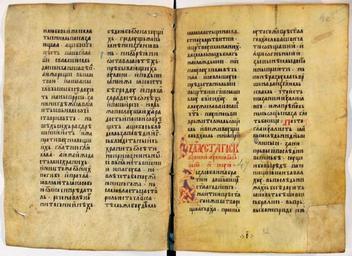 | Keywords: Didactic Gospel.jpg en Page of Didactic Gospel Учительное Евангелие http //www nlr ru/exib/Gospel/slav/22 html Constantine of Preslav Dragoman Константин П еславский пе еписчик - Д агоман 1286 ru Евангелие учительное Константина Болга ского 1286 г со вставками XV в л 164 165 Се бский извод Писец Д агоман F 235/252 х 168/175 II + 179 л Пе гамен л 1-163 166-179 и бумага л 164 165 Че нила кинова ь к аски Текст в 2 столбца на л 1-162 Устав 2-х поче ков Заставка на л 1 и инициалы выполнены кинова ью и к асками желтой и голубой в балканском стиле Заголовки в кото ых используется вязь офо млены азличными способами буквы написаны кинова ью или синей к аской в некото ых случаях желтой к аской нанесен фон Имеется несколько п об о наментальных исунков выполненных пе ом а л 161 г-162 запись писца Д агомана в кото ой гово ится что укопись создана в 1286 г в п авление се бского к аля Стефана У оша повелением а хиепископа Иакова поставленного в том же году В конце молитвы на л 162 находится запись кото ая возможно сообщает имя вто ого писца Писахь я Вукь месеца мая въ 4 днъ далее азмазано Кодекс был обна ужен А Ф Гильфе дингом служившим консулом России в Боснии и Ге цоговине в 1857 г в Дечанском монасты е Этот монасты ь был пост оен в 1327-1335 гг се бским ко олем Стефаном Дечанским 1321-1331 и его сыном пе вым се бским ца ем Душаном 1331-1355 В с едневековье в Дечанах было создано множество бесценных п оизведений а хитекту ы и искусства х амы ф ески иконы укописные книги В начале XV в игуменом монасты я был Г иго ий Цамблак кото ый там написал Житие Стефана Дечанского В 2004 г монасты ь был внесен в список объектов Всеми ного наследия Ю ЕСКО Рукопись поступила в ИПБ в 1868 г в составе соб ания А Ф Гильфе динга Шиф Р Б Гильф 32 PD-old-100 Didactic Gospel |