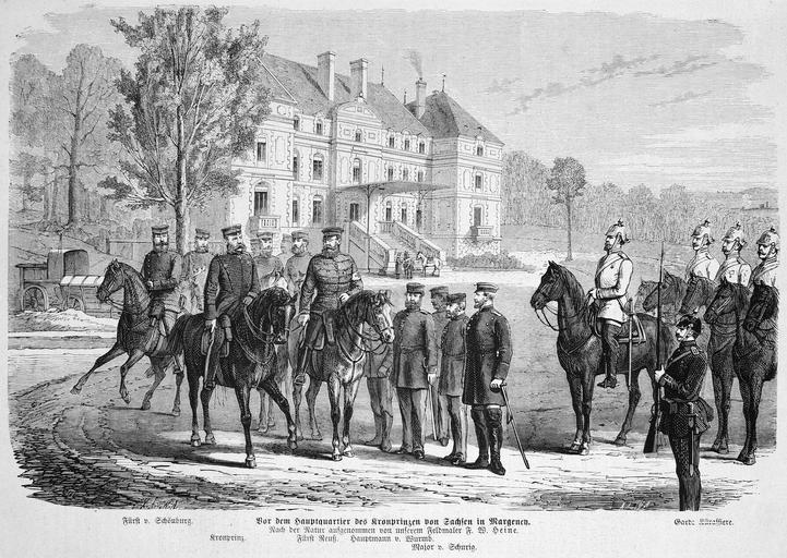 | Keywords: Die Gartenlaube (1871) b 033.jpg 033 034 Die Gartenlaube Franco-Prussian War Albert of Saxony ImageNote 1 1103 2255 1250 95 3460 2458 2 Vor dem Hauptquartier des Kronprinzen von Sachsen in Margency Nach der Natur aufgenommen von unserem Feldmaler F W Heine ImageNoteEnd 1 ImageNote 2 506 2255 363 78 3460 2458 2 Fürst v Schönburg ImageNoteEnd 2 ImageNote 3 891 2324 199 78 3460 2458 2 Kronprinz ImageNoteEnd 3 ImageNote 4 1285 2354 221 48 3460 2458 2 Fürst Reuß ImageNoteEnd 4 ImageNote 5 1522 2350 398 48 3460 2458 2 Hauptmann v Wurmb ImageNoteEnd 5 ImageNote 6 1786 2397 324 35 3460 2458 2 Major v Schurig ImageNoteEnd 6 ImageNote 7 2937 2263 311 74 3460 2458 2 Garde Kürassiere ImageNoteEnd 7 Friedrich Wilhelm Heine Margency |
