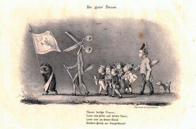 | Keywords: Die gute Presse.jpg Karikatur Die žgute Presse en The good press cartoon The inscription reads Sweet holy censorship Let us go on your trail; Guide us by your hand like children on a leash fr Caricature la Bonne Presse dessinateur inconnu 1847 L'inscription porte « Sainte et douce censure Laisse-nous t'emboîter le pas ; Conduis-nous par la main Comme enfants tenus en laisse » Leuchtturm 1847 Unbekannter Zeichner <gallery>File KarikaturDieGutePresse1847 jpg SW-Version</gallery> PD-old-70-1923 ImageNote 1 438 556 226 103 1004 664 2 Süsse heilige Censur Lass uns gehn auf deiner Spur; Leite uns an deiner Hand Kindern gleich am Gängelband ImageNoteEnd 1 ImageNote 2 434 13 176 44 1004 664 2 Die žgute Presse ImageNoteEnd 2 Censorship 1847 cartoons Caricatures of Germany Animals acting as humans in art Scissors in art Facing left in art Leading strings |