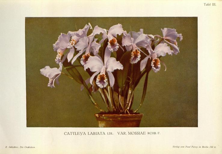 | Keywords: Die Orchideen (Tafel III) (8580167274).jpg Tafel III <br> CATTLEyA LABIATA LDL VAR MOSSIAE RCHB F <br> Scf icO ter Die Orchideen <br> Perfüg i on Pau Parey in Berfin SW// <br> '4 32403887 100868 46623 Tafel III Text http //www biodiversitylibrary org/page/32403887 1915 10 5962/bhl title 46623 Schlechter Rudolf NameFound Labiata NameConfirmed Labiata EOLID 4327536 NameBankID 4211986 Biodiversity Heritage Library Die Orchideen ihre Beschreibung Kultur und Züchtung Handbuch für Orchideenliebhaber Züchter und Botaniker Orchidaceae Orchidaceae culture Missouri Botanical Garden Peter H Raven Library bhl page 32403887 dc identifier http //biodiversitylibrary org/page/32403887 missouri botanical garden peter h raven library Information field Flickr posted date ISOdate 2013-03-22 CC-BY-2 0 BioDivLibrary https //flickr com/photos/61021753 N02/8580167274 2015-08-30 03 52 08 cc-by-2 0 PD-old-70-1923 Rudolf Schlechter - Die Orchideen - 1 Auflage 1915 Cattleya labiata Photos uploaded from Flickr by Fæ using a script |