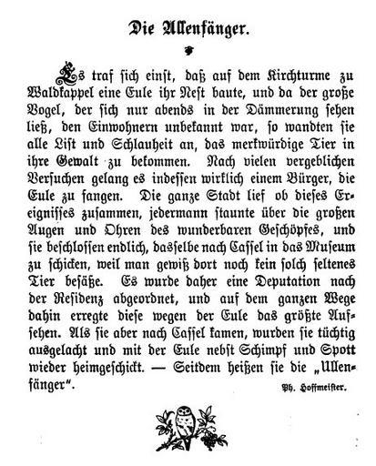 | Keywords: Die Ullenfänger (Hoffmeister).jpg Die Ullenfänger Uhlenfänger Eulenfänger Carl Hessler Sagenkranz aus Hessen-Nassau und der Wartburg-Gegend 1894 S 70 http //books google com/books id A0DaAAAAMAAJ Google-Books < 1874 Philipp Hoffmeister 1804-1874 Philipp Hoffmeister Waldkappel PD-old |