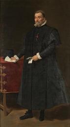 | Keywords: Diego Velázquez 035.jpg Artwork Q3035767 Creator Diego Velázquez Retrato de Diego del Corral y Arellano 1570-1632 que fue oidor del Consejo de Castilla caballero de la Orden de Santiago y catedrático de la Universidad de Salamanca Viste toga negra detalle que junto a los papeles alude a su oficio en la Justicia luce la cruz de Santiago bordada en su pechera símbolo de su origen noble y se acompaña de un sombrero que habla del derecho de don Diego a cubrirse como característica de su alto rango social Cada detalle de la composición lejos de ser anecdótico ha sido cuidadosamente elegido por Velázquez con objeto de caracterizar socialmente a su modelo La técnica empleada por el pintor que combina la proximidad del personaje con un fondo y un suelo neutro y un ligero halo alrededor de la cabeza del personaje sitúan esta obra dentro del estilo de Velázquez de comienzos de la década de los años 30 Este cuadro forma pareja con el retrato de su esposa Doña Antonia de Ipeñarrieta y Galdós y su hijo don Luis P01196 Ambos permanecieron en manos de la familia hasta que fueron legados al Museo del Prado por la duquesa de Villahermosa Ca 1632 oil on canvas Size cm 110 215 Institution Museo del Prado Sala 011 accession number P01195 object history credit line https //www museodelprado es/coleccion/obra-de-arte/don-diego-del-corral-y-arellano/2ad754f0-ead2-4d55-942e-6b24d7c5351d The Yorck Project 10 000 Meisterwerke der Malerei DVD-ROM 2002 ISBN 3936122202 Distributed by DIRECTMEDIA Publishing GmbH http //mail wikipedia org/pipermail/wikide-l/2005-April/012195 html <gallery>Diego Velázquez 056 jpg Portrait of Don Diego's wife</gallery> PD-old-100 PD-Art-YorckProject DEFAULTSORT 1631-1632; Diego de Corral y Arellano Diego del Corral y Arellano by Velázquez Museo del Prado 17th-century oil portraits of standing men at full length in ceremonial robes Baroque paintings of men Black clothing in art male Cross of the Order of Santiago in portrait paintings Portrait paintings of standing men with hands resting on tables Portraits with letters |