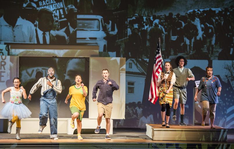 Keywords: lbj library lbjlibrary austin texas lyndon johnson lyndonjohnson president tx usa Pollyanna Theatre Company, a resident theatrical company of the Long Center for Performing Arts in Austin, revived its highly successful 2014 inaugural run of the civil rights-focused play, Liberty! Equality! And Fireworks! by Gregory S. Perrin for a performance at the LBJ Presidential Library on Thursday, February 18, 2016. The special production was free, open to the public, and performed in the LBJ Auditorium. Liberty! Equality! And Fireworks! is set in a history museum. The play's characters, a group of 4th grade students (portrayed by adult professional actors), learn about the U.S. civil rights movement when legendary images from the 1960s come to life and talk to the children. These characters entertain and enlighten, taking children on a fascinating journey through history. LBJ Library photo by Jay Godwin 02/18/2016 Pollyanna Theatre Company, a resident theatrical company of the Long Center for Performing Arts in Austin, revived its highly successful 2014 inaugural run of the civil rights-focused play, Liberty! Equality! And Fireworks! by Gregory S. Perrin for a performance at the LBJ Presidential Library on Thursday, February 18, 2016. The special production was free, open to the public, and performed in the LBJ Auditorium. Liberty! Equality! And Fireworks! is set in a history museum. The play's characters, a group of 4th grade students (portrayed by adult professional actors), learn about the U.S. civil rights movement when legendary images from the 1960s come to life and talk to the children. These characters entertain and enlighten, taking children on a fascinating journey through history. LBJ Library photo by Jay Godwin 02/18/2016