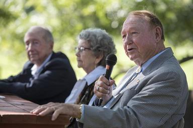 | Keywords: dsc_7015.nef dsc7015nef austin tx usa groupshot people outdoor Barney and Libby Hulett and Mike Howard The Lyndon B. Johnson National Historical Park celebrated the 108th anniversary of President Johnson’s birth with a ceremony at 10:00 am on Saturday, August 27. Continuing a tradition that Lady Bird Johnson began in 1973, a wreath was placed at the president’s gravesite in the Johnson family cemetery at the LBJ Ranch by Park Superintendent Russ Whitlock and Brigadier General Heather L. Pringle. After the ceremony, park staff members commemorated the National Park Service Centennial by reading the names of the 47 national park units established during Lyndon Johnson’s presidency. LBJ Library photo by Jay Godwin 08/27/2016 Barney and Libby Hulett and Mike Howard The Lyndon B. Johnson National Historical Park celebrated the 108th anniversary of President Johnson’s birth with a ceremony at 10:00 am on Saturday, August 27. Continuing a tradition that Lady Bird Johnson began in 1973, a wreath was placed at the president’s gravesite in the Johnson family cemetery at the LBJ Ranch by Park Superintendent Russ Whitlock and Brigadier General Heather L. Pringle. After the ceremony, park staff members commemorated the National Park Service Centennial by reading the names of the 47 national park units established during Lyndon Johnson’s presidency. LBJ Library photo by Jay Godwin 08/27/2016 |