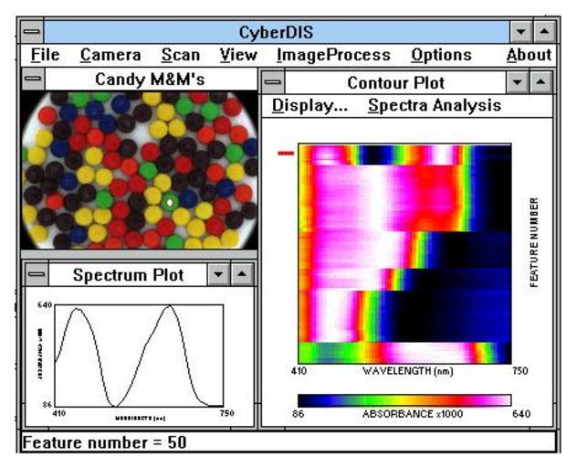 Keywords: Digital Imaging Spectroscopy 1.JPG Full spectrum of a plate of M Ms candy Own 1998 Doug youvan Digital image spectroscopy