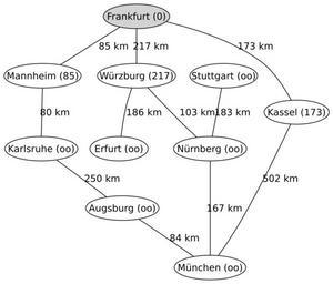 Keywords: DijkstraStep01.svg First Step of a run of Dijkstra's algorithm on a map of Germany see Image MapGermanyGraph svg Created by de Benutzer Regnaron with graphviz Dijkstra's algorithm