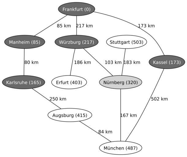 Keywords: DijkstraStep06.svg Sixth Step of a run of Dijkstra's algorithm on a map of Germany see Image MapGermanyGraph svg Created by de Benutzer Regnaron with graphviz Dijkstra's algorithm