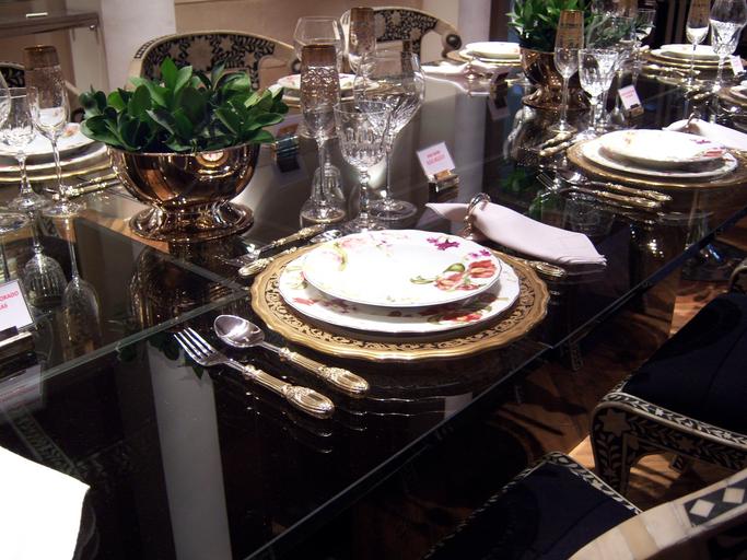 Keywords: dining table dinner appliance of dinner dishes cutlery bowls luxury sophistication