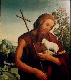 | Keywords: Diogo de Contreiras - São João Baptista.jpg pt Em primeiro plano ligeiramente deslocado para a direita São João Baptista que aparece como um homem de meia idade de barba e cabelo castanho vestindo uma túnica de pele castanha e colocado sobre o ombro esquerdo um manto vermelho No braço esquerdo segura um livro aberto sobre o qual está um pequeno cordeiro branco Na mão direita segura uma cruz feita de canas Do lado esquerdo em segundo plano está representada a cena do baptismo de Cristo e mais ao fundo uma cidade Do lado direito uma árvore Toda esta parte da pintura está pintada em tons de azul e verde constratando com a personagem principal que se destaca sobre este fundo 2012-12-18 00 43 27 http //www matriznet imc-ip pt/ Creator Diogo de Contreiras PD-old-100 Diogo de Contreiras Uploaded with UploadWizard Images from the Instituto dos Museus e da Conservação Paintings of John the Baptist in Portugal Paintings in the Museu de Évora |