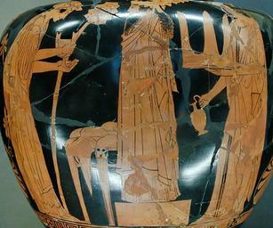 | Keywords: Dionysiac cult Louvre G407 n2.jpg Dionysiac cult Detail from an Attic red-figure stamnos ca 450-440 BC From Vulci Culte dionysiaque Détail d'un stamnos attique à figures rouges du Peintre d'Eupolis vers 450-440 av J -C H 39 cm 15 ¼ in W 40 4 cm 15 ¾ in Diam 32 2 cm 12 ½ in Museum Louvre Department of Greek Etruscan and Roman Antiquities Sully first floor room 39 case 8 object history credit line Canino Collection; purchase 1843 accession number G 407 Jastrow 2007 other versions <gallery> Image Dionysiac cult Louvre G407 jpg </gallery> Dionysos in ancient Greek pottery Thyrsos in ancient Greek pottery Cultic practices in ancient Greek pottery Kantharoi in art Oinochoes in art Stamnoi Eupolis Painter Greek antiquities in the Louvre - Room 39 450s BC pottery in France 440s BC pottery in France Ancient Greek pottery from Vulci Attic red-figure pottery |