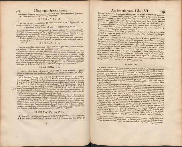 | Keywords: Diophantus VI 338 339.jpg Area trianguli rectanguli in numeris non potest esse quadratus hujus theorematis a nobis inventi demonstrationem quam et ipsi tandem non sine operosa laboriosa meditatione deteximus subiungemus Hoc nempe demonstrandi genus miros in arithmeticis suppeditabit progressus si area trianguli esset quadratus darentur duo quadratoquadrati quorum differentia esset quadratus Unde sequitur dari duo quadratos quorum summa differentia esset quadratus Datur itaque numerus compositus ex quadrato duplo quadrati æqualis quadrato ea conditione ut quadrati eum componentes faciant quadratum Sed si numerus quadratus componitur ex Quadrato duplo alterius quadrati eius latus similiter componitur ex quadrato duplo quadrati ut facillime possumus demonstrare <br /> Unde concludetur latus illud esse summam laterum circa rectum trianguli rectanguli unum ex quadratis illud componentibus efficere basem duplum quadratum æquari perpendiculo <br /> Illud itaque triangulum rectangulum conficietur a duobus quadratis quorum summa differentia erunt quadrati At isti duo quadrati minores probabuntur primis quadratis primo suppositis quorum tam summa quam differentia faciunt quadratu Ergo si dentur duo quadrata quorum summa differentia faciant quadratum dabitur in integris summa duorum quadratorum eiusdem naturæ priore minor Eodem ratiocinio dabitur minor ista inuenta per utam prioris semper in infinitum minores inuenientur numeri in integris idem præstantes Quod impossibile est quia dato numero quouis integro non possunt dari infiniti in integris illo minores Demonstrationem integram fusius explicatam inserere margini vetat ipsius exiguitas <br /> Hac ratione deprehendimus demonstratione confirmatus nullum numerum triangulum præter vnitatem æquari quadratoquadrato OBSERVATIO D P F Facsimile from original edition 1670 Leonid 2015-12-20 PD-old-100 Fermat's last theorem Arithmetica |