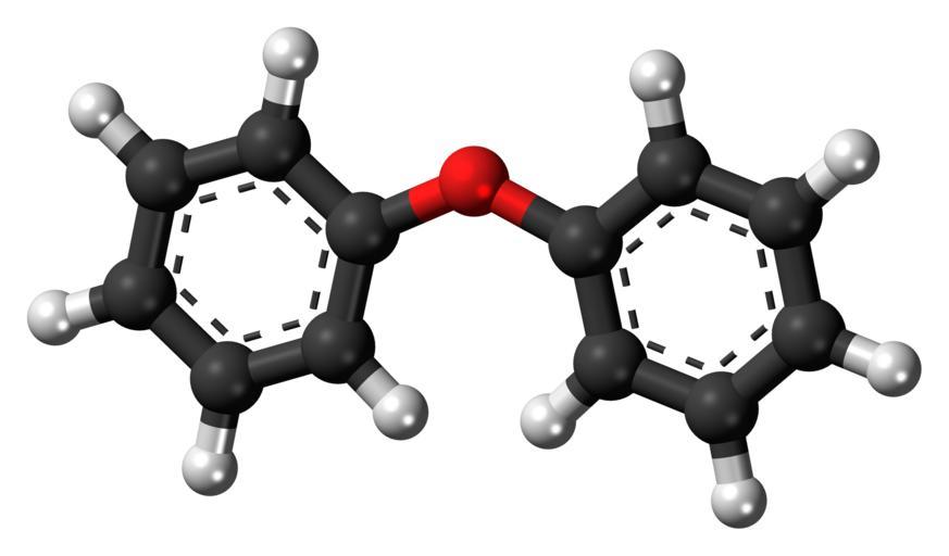 | Keywords: Diphenyl ether 3D ball.png Ball-and-stick model of the diphenyl ether molecule also known as phenoxybenzene Colour code 505050 Carbon C black<br> F0F0F0 Hydrogen H white<br> F51E1E Oxygen O red<br> 2011-06-27 own DS Visualizer Jynto talk Space-filling version cc-zero Images by Jynto Ball-and-stick models Diphenyl_ether |