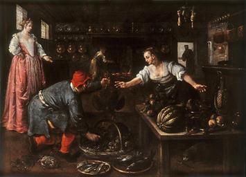 | Keywords: Dirck de Vries - Kitchen Interior - Walters 372651.jpg De Vries was one of many Netherlandish artists who left his war-torn homeland to come to Venice where he painted Netherlandish subjects in a Venetian style As in the Netherlandish tradition the kitchen of this wealthy home is full of everyday details such as meat hung to dry The cook reaches for the roosters offered by the tradesman In Dutch plays on the word for bird can refer to sexual intercourse In the lusty manner of Netherlandish paintings and popular prints of market folk the man is propositioning the cook in front of her mistress who does not understand peasant body language The lady's dress and platform shoes identify her and the setting as Venetian and De Vries has adopted the broad brush strokes of his Venetian colleagues ca 1600 Oil on canvas cm 97 8 134 7 accession number 37 2651 9960 Sale Christie's New York January 11 1991 lot 17 Walters Art Museum 1991 by purchase Museum purchase 1991 Artful Dining The Exhibition The Walters Art Gallery Baltimore 1994 place of origin Venice Italy Walters Art Museum license 2D Renaissance paintings in the Walters Art Museum Dirck de Vries Kitchen interiors in Dutch genre paintings 1600 paintings in the United Kingdom Paintings of baskets Pumpkins in paintings Crabs in art Copper in art 17th-century oil on canvas paintings in the United Kingdom Chopines |