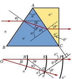 | Keywords: Direct-vision Prism.svg direct-vision prism Crown glass is shown in blue flint in yellow As this kind of prism is dispersive other colours will not emerge normal to the end surface A graphic ray tracing method is shown Three arcs are drawn with radii proportional to the refractive indices of the medium crown and flint and a line perpendicular to AC through P Own Inductiveload 2009-02-05 Optics diagrams Amici prisms Direct-vision prisms | ||||