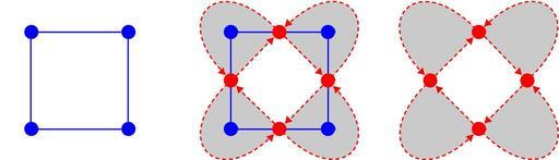 | Keywords: Directed medial graph example.svg en Example of a plane graph in blue and its directed medial graph in red <source lang latex > \documentclass standalone \usepackage tikz \usetikzlibrary arrows backgrounds positioning \begin document \def\nodeDist 2 5cm \def\arrowType triangle 60 \def\fillColor black 20 \def\position 0 6 \tikzstyle origVertex draw blue fill shape circle \tikzstyle newVertex draw red fill shape circle \tikzstyle invisibleVertex shape circle \tikzstyle origEdge blue \tikzstyle newEdge red densely dashed \tikzstyle invisibleEdge draw opacity 0 \begin tikzpicture node distance \nodeDist > \arrowType semithick \nodeorigVertex 0 ; \nodeorigVertex 1 right of 0 ; \nodeorigVertex 2 below of 1 ; \nodeorigVertex 3 left of 2 ; \path 0 edgeorigEdge nodeinvisibleVertex m0 1 1 edgeorigEdge nodeinvisibleVertex m1 2 2 edgeorigEdge nodeinvisibleVertex m2 3 3 edgeorigEdge nodeinvisibleVertex m3 0 ; \path m0 edgeinvisibleEdge m1 edgeinvisibleEdge out 45 in 45 looseness 3 overlay nodeinvisibleVertex pos \position e0 m1 m1 edgeinvisibleEdge m2 edgeinvisibleEdge out -45 in -45 looseness 3 overlay nodeinvisibleVertex pos \position e1 m2 m2 edgeinvisibleEdge m3 edgeinvisibleEdge out -135 in -135 looseness 3 overlay nodeinvisibleVertex pos \position e2 m3 m3 edgeinvisibleEdge m0 edgeinvisibleEdge out 135 in 135 looseness 3 overlay nodeinvisibleVertex pos \position e3 m0 ; \nodeinvisibleVertex below 0cm of e0 ; \nodeinvisibleVertex left 0cm of e1 ; \nodeinvisibleVertex above 0cm of e2 ; \nodeinvisibleVertex right 0cm of e3 ; \end tikzpicture \qquad \begin tikzpicture node distance \nodeDist > \arrowType semithick \nodeorigVertex 0 ; \nodeorigVertex 1 right of 0 ; \nodeorigVertex 2 below of 1 ; \nodeorigVertex 3 left of 2 ; \path 0 edgeorigEdge nodenewVertex m0 1 1 edgeorigEdge nodenewVertex m1 2 2 edgeorigEdge nodenewVertex m2 3 3 edgeorigEdge nodenewVertex m3 0 ; \path m0 edge-> newEdge m1 edge<- newEdge out 45 in 45 looseness 3 overlay nodeinvisibleVertex pos \position e0 m1 m1 edge-> newEdge m2 edge<- newEdge out -45 in -45 looseness 3 overlay nodeinvisibleVertex pos \position e1 m2 m2 edge-> newEdge m3 edge<- newEdge out -135 in -135 looseness 3 overlay nodeinvisibleVertex pos \position e2 m3 m3 edge-> newEdge m0 edge<- newEdge out 135 in 135 looseness 3 overlay nodeinvisibleVertex pos \position e3 m0 ; \nodeinvisibleVertex below 0cm of e0 ; \nodeinvisibleVertex left 0cm of e1 ; \nodeinvisibleVertex above 0cm of e2 ; \nodeinvisibleVertex right 0cm of e3 ; \begin scope on background layer overlay \fillfill \fillColor m0 45 to out 45 in 45 looseness 3 m1 45 to m1 center to m0 center to m0 45 ; \fillfill \fillColor m1 -45 to out -45 in -45 looseness 3 m2 -45 to m2 center to m1 center to m1 -45 ; \fillfill \fillColor m2 -135 to out -135 in -135 looseness 3 m3 -135 to m3 center to m2 center to m2 -135 ; \fillfill \fillColor m3 135 to out 135 in 135 looseness 3 m0 135 to m0 center to m3 center to m3 135 ; \end scope \end tikzpicture \qquad \begin tikzpicture node distance \nodeDist > \arrowType semithick \nodeinvisibleVertex 0 ; \nodeinvisibleVertex 1 right of 0 ; \nodeinvisibleVertex 2 below of 1 ; \nodeinvisibleVertex 3 left of 2 ; \path 0 edgeinvisibleEdge nodedraw opacity 100 newVertex m0 1 1 edgeinvisibleEdge nodedraw opacity 100 newVertex m1 2 2 edgeinvisibleEdge nodedraw opacity 100 newVertex m2 3 3 edgeinvisibleEdge nodedraw opacity 100 newVertex m3 0 ; \path m0 edge-> newEdge m1 edge<- newEdge out 45 in 45 looseness 3 overlay nodeinvisibleVertex pos \position e0 m1 m1 edge-> newEdge m2 edge<- newEdge out -45 in -45 looseness 3 overlay nodeinvisibleVertex pos \position e1 m2 m2 edge-> newEdge m3 edge<- newEdge out -135 in -135 looseness 3 overlay nodeinvisibleVertex pos \position e2 m3 m3 edge-> newEdge m0 edge<- newEdge out 135 in 135 looseness 3 overlay nodeinvisibleVertex pos \position e3 m0 ; \nodeinvisibleVertex below 0cm of e0 ; \nodeinvisibleVertex left 0cm of e1 ; \nodeinvisibleVertex above 0cm of e2 ; \nodeinvisibleVertex right 0cm of e3 ; \begin scope on background layer overlay \fillfill \fillColor m0 45 to out 45 in 45 looseness 3 m1 45 to m1 center to m0 center to m0 45 ; \fillfill \fillColor m1 -45 to out -45 in -45 looseness 3 m2 -45 to m2 center to m1 center to m1 -45 ; \fillfill \fillColor m2 -135 to out -135 in -135 looseness 3 m3 -135 to m3 center to m2 center to m2 -135 ; \fillfill \fillColor m3 135 to out 135 in 135 looseness 3 m0 135 to m0 center to m3 center to m3 135 ; \end scope \end tikzpicture \end document </source> Self 2013-03-26 Graph theory Images with LaTeX source code Cc-zero |