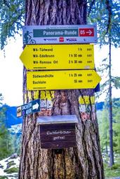 Keywords: directory alpine hiking shield arrow wood mountains direction mountaineering hiking trails signposts marking route mark