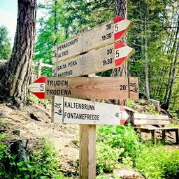 Keywords: directory signs note away signposts nature direction trail wood mountains hiking trudner höhenweg truden south tyrol italy hike mountain hiking forest summer forest path