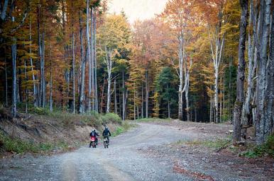 Keywords: dirt bikes motorbikes bikers road trees forest woods autumn fall