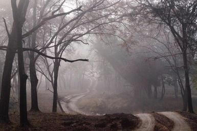 Keywords: dirt road fog mist forest wood nature landscape trees path trail country lane