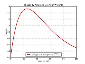| Keywords: Disability Adjusted Life Year Weight Plot.svg en Plot of the arbitrary formula used to discount years of life for the young and old in policy decisions Year of life against weights using the reationship y 0 1658 year e -0 04 year Svg made with matplotlib for python - Some studies use DALYs calculated to place greater value on a year lived as a young adult This formula produces average values around age 10 and age 55 a peak around age 25 and lowest values among very young children and very old people Comparable to Figure 3 1 in this WHO report http //www who int/quantifying_ehimpacts/publications/en/9241546204chap3 pdf 2012-01-10 own Martin Strand Uploaded with UploadWizard Public health Healthcare statistics United Nations World Health Organization |
