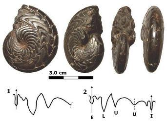 | Keywords: Discoclymenia cucullata Late Devonian Morocco.jpg en Discoclymenia cucullata BUCH ; goniatite belonging to the genus Discoclymenia HYATT Pyritized specimen from Late Devonian of Morocco The sutural pattern of the specimen 1 is reported external part ; the complete suture of the species is shown in 2 E external lobe; L lateral lobe; U umbilical lobe; I internal lobe own Antonov 1009-10-22 Discoclymenia Devonian fossils from Morocco Goniatitida fossils | ||||