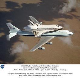 Keywords: Discovery Atop 747 Over The Mojave (EC05-0166-40) DVIDS724327.jpg en NASA's modified Boeing 747 Shuttle Carrier Aircraft with the Space Shuttle Discovery on top lifts off from Edwards Air Force Base to begin its ferry flight back to the Kennedy Space Center in Florida The cross-country journey will take two days with stops at several intermediate points for refueling Space shuttle Discovery landed safely at NASA's Dryden Flight Research Center at Edwards Air Force Base in California at 5 11 22 a m PDT August 9 2005 following the very successful 14-day STS-114 return to flight mission During their two weeks in space Commander Eileen Collins and her six crewmates tested out new safety procedures and delivered supplies and equipment the International Space Station Discovery spent two weeks in space where the crew demonstrated new methods to inspect and repair the Shuttle in orbit The crew also delivered supplies outfitted and performed maintenance on the International Space Station A number of these tasks were conducted during three spacewalks In an unprecedented event spacewalkers were called upon to remove protruding gap fillers from the heat shield on Discovery's underbelly In other spacewalk activities astronauts installed an external platform onto the Station's Quest Airlock and replaced one of the orbital outpost's Control Moment Gyroscopes Inside the Station the STS-114 crew conducted joint operations with the Expedition 11 crew They unloaded fresh supplies from the Shuttle and the Raffaello Multi-Purpose Logistics Module Before Discovery undocked the crews filled Raffeallo with unneeded items and returned to Shuttle payload bay Discovery launched on July 26 and spent almost 14 days on orbit NASA Identifier nasahqphoto-6841309022 2012-06-15 Glenn Research Center https //www dvidshub net/image/724327 724327 2012-10-15 17 23 WASHINGTON DC US PD-USGov Edwards Air Force Base Images from DoD uploaded by Fæ Space Shuttle Discovery