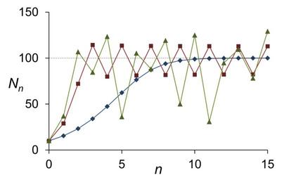 | Keywords: Discrete logistic equation-time evolutions.svg ja 離散型ロジスティック方程式の時間発展の例 計算式は以下のとおり: <math> N_ n+1 N_ n +rN_n 1-\frac N_n K </math> 各パラメータは 全色:K 100 N<sub>0</sub> 10 :r 0 6 赤:r 2 1 緑:r 3とした 2016-07-23 own Yapparina other versions cc-zero Logistic functions Logistic map |