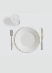 Keywords: dishes white plate stemware plate empty glass fork knife table