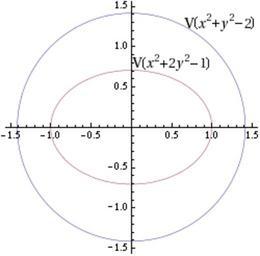 | Keywords: Disjoint ellipses.png en A diagram showing two curves a small ellipse and a larger circle which do not intersect de Ein Diagramm was zwei Kurven zeigt eine kleinere Ellipse und einen größeren Kreis die sich nicht schneiden own Pmidden 2009-11-02 Mathematica command used <nowiki>ContourPlot x 2 + y 2 - 2 0 x 2 + 2 y 2 - 1 0 x -1 5 1 5 y -1 5 1 5 Axes -> True Frame -> False ImageSize -> 250 Epilog -> Text Style V x 2+y 2-2 FontSize -> 14 1 1 1 3 Text Style V x 2+2y 2-1 FontSize -> 14 0 5 0 8 </nowiki> Ellipses Images with Mathematica source code |