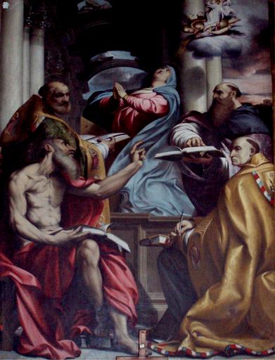 | Keywords: Disputa sull'Immacolata Concezione - Agostino Carracci (or Annibale?) after Pordenone.jpg year 1595 approx Olio su tela Size cm Chiesa della Santissima Annunziata di Cortemaggiore Piacenza object history exhibition history credit line place of creation L'opera รจ una copia da un dipinto del Pordenone in origine collocato nello stesso luogo dove ora si trova questa tela eseguita da Agostino Carracci o meno probabilmente dal fratello di questi Annibale La pala del Pordenone fu donata dai Pallavicino che ne erano proprietari ad Odoardo Farnese il quale in segno di riconoscenza verso i donatori gliene face fare una copia dai Carracci - pittori bolognesi che operavano al suo servizio - con la quale sostituire l'originale Il dipinto del Pordenone come moltissime altre opere appartenute ai Farnese si trova oggi a Napoli nella Galleria di Capodimonte L'originale del Pordenone <gallery> File Pordenone Disputa sull'immacolata concezione 1528 ca Q86 01 JPG</gallery> https //it wikipedia org/wiki/File Immacolata_concezione_pordenone JPG accession number PD-old-100 Agostino Carracci Annibale Carracci |