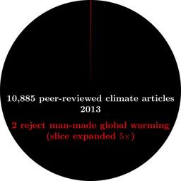| Keywords: Dissenting Climate Articles, 2013.svg en English A survey of peer-reviewed scientific articles from 2013 finds that only 2 of 10885 reject anthropogenic global warming 2016-06-25 own Snubcube other versions \documentclass article \usepackage pstricks pst-plot color \usepackagemargin 0cm papersize 200px 200px geometry \begin document \noindent \psset unit 100px algebraic \begin pspicture -1 -1 1 1 \pscirclelinewidth 0 linestyle none fillcolor black fillstyle solid 0 0 1 \pscustomlinewidth 0 linestyle none fillcolor red fillstyle solid \psarc 0 0 1 90 2 10885 div 360 mul 5 mul sub 90 \lineto 0 0 \uputd 0 0 \begin minipage 200px \centering\bf \white 10 885 peer-reviewed climate articles\\ 2013\\ 5em \red 2 reject man-made global warming\\ slice expanded 5\times \end minipage \end pspicture \end document Cc-zero Climate change denial Global warming Climate change |