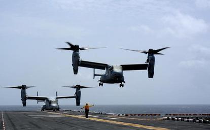 | Keywords: Distinguished visitors from Trinidad and Tobago visit USS America 140725-N-AC979-003.jpg en Two tiltrotor MV-22 Osprey assigned to the Argonauts of Marine Operational Test and Evaluation Squadron VMX 22 transport distinguished visitors from Trinidad and Tobago to the future amphibious assault ship USS America LHA 6 America is currently traveling through the U S Southern Command and U S 4th Fleet area of responsibility on its maiden transit America visits the Americas America is the first ship of its class replacing the Tarawa-class of amphibious assault ships As the next generation big-deck amphibious assault ship America is optimized for aviation capable of supporting current and future aircraft such as the Osprey and F-35B Joint Strike Fighter The ship is scheduled to be ceremoniously commissioned Oct 11 in San Francisco U S Navy photo by Mass Communication Specialist 1st Class Michael McNabb/Released 2014-07-25 Petty Officer 3rd Class Michael McNabb https //www dvidshub net/image/1465791 140725-N-AC979-003 2014-07-26 11 58 USS AMERICA AT SEA PD-USGov-Military-Navy MV-22B Osprey USS America LHA-6 Images from DoD uploaded by Fæ |