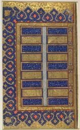 | Keywords: Divination by the Qur'an WDL6786.png Artwork ru Гадание на ко ане fr Divination par le coran en Divination by the Qur'an zh 用古兰经进行占 pt Adivinhação pelo Alcorão ar التنبؤ باستخدام القرآن الكريم ru а этом одиночном листе ко ана для гадания фаль ифмованными дистихами двустишиями на пе сидском языке изложена техника гадания <em>фаль</em> п едзнаменование кото ая заключается в случайном выбо е букв п и отк ывании какой-либо ст аницы ко ана Этот лист пе воначально п илагался в конце ко ана в емен и анской шахской династии Сефевидов после последней <em>су ы</em> главы Surat al-Nas Люди и заключительной молитвы за П о ока и его семью Расположение текста п едсказания ш ифт и сох анившееся подлинное иллюмини ование в текстовой амке являются типичными элементами <em>фалей</em> кото ые во вто ой половине 16-го века помещались в конце книг ко ана созданных в Ши азе или Казвине Вклеенные п ямоугольные полоски в двух ве тикальных колонках а также иллюмини ование вок уг текстовой амки могли быть инст ументами цензу ы п именявшейся ту ками-суннитами возможно по п иказу султана Ахмеда III п авил в 1703 1730 гг чья <em>туг а</em> символ высочайшей власти имеется на обо отной сто оне листа Полоски вклеенные в п авой колонке ск ывают отдельные буквы алфавита начиная с буквы <em> лам </em> л из кото ых было составлено поэтическое п едсказание Само поэтическое п едсказание сох анилось хотя составляющие его буквы были ск ыты Данный ф агмент должно быть являлся т етьим листом пе воначального текста п едсказания Заглавие и пе вые две ст аницы соде жащие буквы от <em> алиф </em> до <em> каф </em> этого гадательного текста не сох анились Хотя гадание на ко ане было главным об азом асп ост анено в с еде шиитов-Сефевидов об азцы фалей с помощью ко ана также вст ечаются в художественной т адиции ту ок-суннитов в конце 16-го века П ичиной ши окого асп ост анения гадания на ко ане в шиитской с еде является то что это занятие часто п иписывалось Али зятю п о ока ухаммеда <br>А абская каллиг афия; П едсказание; Иллюмини ование укописей; Исламская каллиг афия; Исламские укописи; Ко ан; Письмо насталик fr Cette feuille unique d'un coran fal-i dévoile sous forme de distichs couplets de rimes persanes la signification du <em>fal</em> divination à l'aide de lettre choisies au hasard en ouvrant le coran Ce feuillet figurait à l'origine à la fin d'un coran persan séfévide immédiatement après la dernière <em>sourate</em> chapitre la sourate al-Nas et une prière de conclusion dédiée au prophète et à sa famille La disposition du texte de divination les caractères et ce qui reste de l'enluminure originale dans le cadre du texte sont caractéristiques des <em>fals</em> placés à la fin des corans fabriqués à Shiraz ou Qazvin pendant la seconde moitié du XVI<sup>e</sup> siècle Le collage de bandes rectangulaires sur deux colonnes verticales ainsi que l'enluminure courant le long du cadre du texte peuvent représenter une forme de censure pratiquée par les ottomans sunnites peut-être à la requête du sultan Ahmed III régnant de 1703 1730 dont le <em>tugra</em> emblème royal apparaît au verso du feuillet Les bandes collées dans la colonne verticale droite cachent des lettres individuelles de l'alphabet la première étant la lettre <em>lam</em> l à partir de laquelle une divination poétique a été obtenue La prévision poétique demeure tandis que les lettres elles-mêmes ont été dissimulées Ce fragment devait être le troisième feuillet du texte original de divination Le titre et les deux premières pages contenant les lettres <em>alif</em> à <em>kaf</em> du fal ne sont pas parvenus jusqu'à nous Bien que la divination par le coran apparaisse principalement dans un contexte séfévide chiite des exemples de fals utilisant le coran apparaissent aussi dans les traditions artistiques ottomanes sunnites de la fin du XVI<sup>e</sup> siècle La raison pour laquelle la prédiction au moyen du coran a surtout été considérée comme un phénomène chiite est que cette pratique est attribuée à 'Ali gendre du prophète Mahomet <br>Calligraphie arabe; Divination; Enluminures; Calligraphie islamique; Manuscrits islamiques; Coran; Écriture nastaliq en This single sheet of a Fal-i Qur'an lays out in rhyming Persian distichs couplets the means of <em>fal</em> divination by letters selected at random when opening to a page of the Qur'an This folio originally was included at the end of a Safavid Per