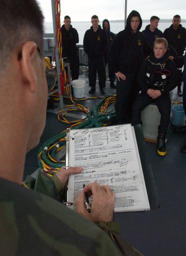 | Keywords: Diving training -e.jpg en 030122-N-6967M-232 Safety briefs are the first and most important part of every dive at school and in the fleet All Hands June 2003 pg 22 Photo by PH1 Shane T McCoy RELEASED http //www news navy mil/view_ahhphotos asp page 80 Shane T McCoy 2003-06 PD-USGov-Military-Navy Photographs by Shane T McCoy Underwater diver training Sailors from the United States Navy Briefings Surface supplied diving Surface equipment for underwater diving | ||||