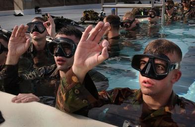 | Keywords: Diving training -g.jpg en 030122-N-6967M-026 Masks full of water the new Marine Combat Diver class signals ok as the Instructor passes New students are trained to clear water from a mask even at the bottom of the ocean All Hands June 2003 pg 19 Photo by PH1 Shane T McCoy RELEASED http //www news navy mil/view_ahhphotos asp page 80 Shane T McCoy 2003-06 PD-USGov-Military-Navy Photographs by Shane T McCoy Underwater diving techniques and processes Diving hand signals O gesture with thumb and forefinger Men in swimming pools |