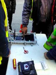 | Keywords: Divisores Ópticos caixa (A Coruña).jpg gl Técnico sinalando os tres divisores ópticos 1 4 dunha caixa de empalmes FTTH en primeiro termo unha fusionadora de fibra óptica 2013-12-14 12 33 05 own Nemigo cc-zero Uploaded with UploadWizard Optical fibers |