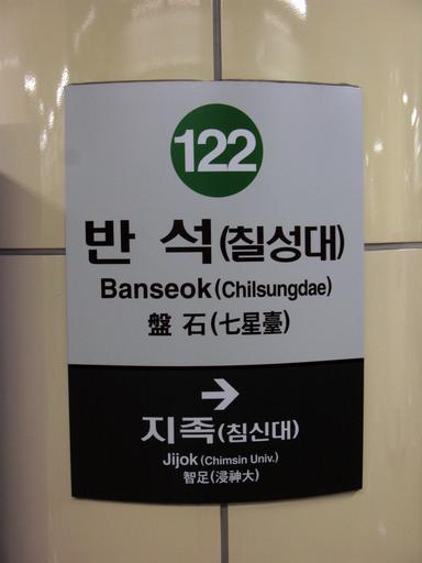 Keywords: DJET Banseok Station-Sign.JPG Daejeon Subway Line 1 Banseok Station 전 도 철도 1호선 반 역 역 명판 大田都市鉄道1号線盤石駅の駅名標 2008-01-15 Own IRTC1015 Banseok Station Train station signs in South Korea