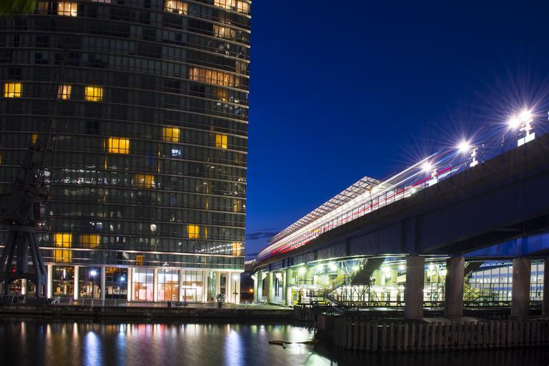 Keywords: outdoor architecture city building building structure infrastructure night skyline Light trails. Train in London Light trails. Train in London