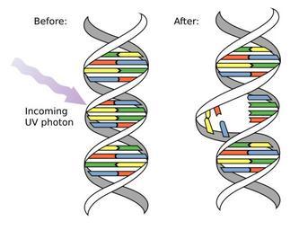 | Keywords: DNA UV mutation.svg ValidSVG Ultraviolet UV photons harm the DNA molecules of living organisms in different ways In one common damage event adjacent bases bond with each other instead of across the ladder This makes a bulge and the distorted DNA molecule does not function properly Ultraviolette UV Photonen schaden den DNS Molekülen lebender Organismen auf verschiedene Weise Eine Variante ist dass nebeneinander liegende Basen sich miteinander verbinden anstatt mit ihrem Gegenüber Dies verursacht eine Ausbeulung worauf das deformierte DNS Molekül nicht mehr normal funktioniert DNA_UV_mutation gif 2010-09-02 20 47 UTC derivative work Mouagip <span class signature-talk >talk</span> DNA_UV_mutation gif NASA/David Herring created with Adobe Illustrator translation possible Original upload log This image is a derivative work of the following images File DNA_UV_mutation gif licensed with PD-USGov-NASA 2006-05-24T11 58 04Z GunnerPoulsen 350x270 13052 Bytes <nowiki>Ultraviolet UV photons harm the DNA molecules of living organisms in different ways In one common damage event adjacent bases bond with each other instead of across the ladder This makes a bulge and the distorted</nowiki> Uploaded with derivativeFX Mutations Ultraviolet light DNA helix-structures |