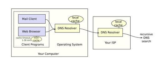 | Keywords: DNS in the real world.svg Mail client web browser with miniature DNS cache Client programs connect with a DNS resolver incorporated into the operating system of your computer The DNS resolver in your operating system is connected to your ISP's DNS resolver which also has a cache If something isn't found it's looked up via recursive DNS search Created by Lion Kimbro from reading of the text of Domain Name System DNS in the Real World own Lion Kimbro File DNS in the real world hu svg Hungarian translation - DNS flow diagrams |