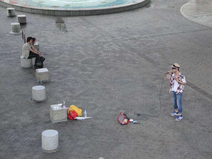 Keywords: Do-tei(street musician).JPG ja w ja 若宮大 の公 で2人の聴衆を前に歌うラッパーDo own Muji tv 2010-07-12 Cc-zero Street musicians in Japan