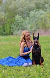 Keywords: doberman woman and dog field naturally blonde woman lie beauty dream green grass spring outdoors