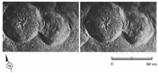 | Keywords: Dobrovolskiy Shirakatsi craters p148a.jpg The craters Shirakatsi left and Dobrovol'skiy right on the far side of the moon This is the first photo of Figure 148 of Apollo Over the Moon NASA SP-362 1978 which has the following caption edited for clarity because the two craters were not formally named at the time of publication <br>This pair of overlapping medium-sized craters illustrates some of the criteria used to determine relative ages Material ejected from the larger polygonal crater Shirakatsi on the left partially fills the smaller crater on the right Dobrovol'skiy ; thus the crater on the left is younger Furthermore the wall of the large crater is complete whereas the west wall of the smaller crater is absent obviously having been destroyed by the larger crater Even if the two craters did not overlap the sharp rim terraced walls and prominent central peak of the larger crater clearly identify it as the younger of the two The frames used in the stereogram p148a were selected to show exaggerated relief a technique very helpful to photointerpreters in determining shapes and relative elevations of surface features The two craters are located in the rugged terrain of the far-side highlands approximately 250 km north of the prominent crater Tsiolkovsky The photograph below hrp148b is an oblique view of the same pair of craters It is included not because it is a more dramatic view but because it shows from another perspective that one crater clearly is superposed on the other -M C M en wikipedia Apollo 17 Mapping camera images AS17-M-2006 and AS17-M-2007 cropped to show Dobrovol'skiy and Shirakatsi craters <br/> Immediate source NASA History Program Office http //history nasa gov/SP-362/contents htm Apollo Over the Moon A view from orbit NASA SP-362 1978 <br>Figure 148 http //history nasa gov/SP-362/p148a jpg p148a original 1972 published 1978 NASA<br/> PD-USGov Original upload log en wikipedia Dobrovolskiy+Shirakatsi+craters+p148a jpg wikitable - 2014-03-03 17 09 345×160× 12238 bytes Jstuby The craters Shirakatsi left and Dobrovolskiy right on the far side of the moon This is the first photo of Figure 148 of Apollo Over the Moon NASA SP-362 1978 Apollo 17 moon photography Dobrovol'skiy lunar crater Shirakatsi lunar crater |