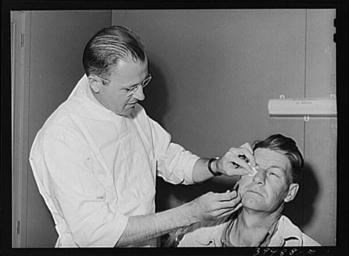 Keywords: Doctor at a FSA labor camp.jpg en Doctor treats a patients eye for a minor burn 2013-12-03 10 35 07 Farm Security Administration Lee Russell PD-USGov Uploaded with UploadWizard Uncategorized 2013 December 3