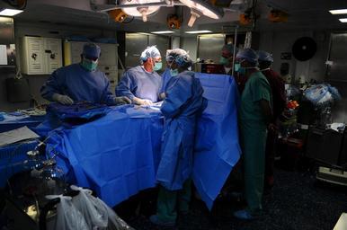 Keywords: Doctors perform surgery, hernia operation aboard USS Kearsarge DVIDS122191.jpg en Eliecer Cruz Alvarez right a general surgeon with the Dominican national police and Lt Cmdr Heliodoro Andres Salas Cablera an anesthesiologist with the Dominican Republic navy embarked aboard the amphibious assault ship USS Kearsarge conduct a cooperative surgery with medical personnel Kearsarge is the primary platform for the Caribbean phase of the humanitarian/civic assistance mission Continuing Promise 2008 an equal-partnership mission involving the United States Canada the Netherlands Brazil France Nicaragua Colombia Dominican Republic Trinidad and Tobago and Guyana 2008-10-12 https //www dvidshub net/image/122191 081012-N-+++++-010 2008-10-15 00 07 CARIBBEAN SEA AT SEA PD-USGov-Military-Navy USS Kearsarge LHD-3 Images from DoD uploaded by Fæ
